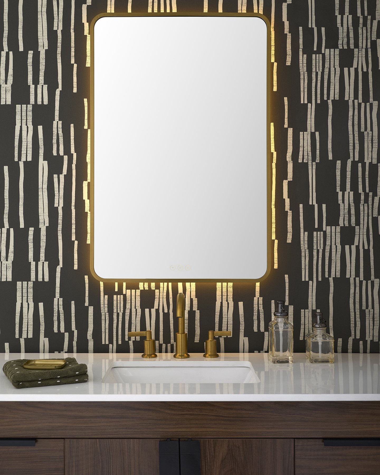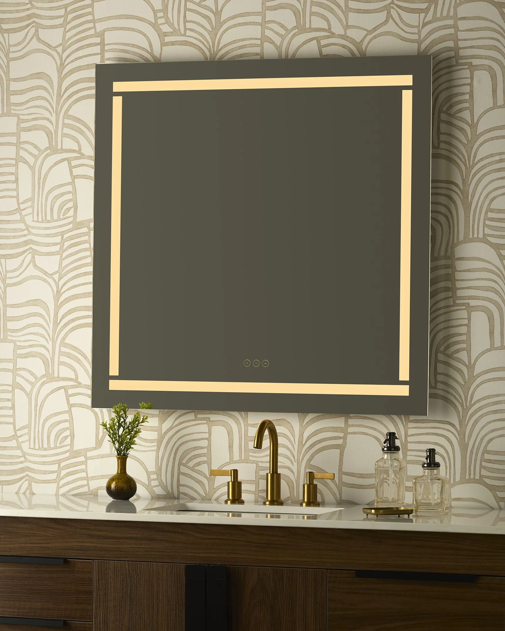 With four frosted areas, the Lingo LED Mirror is a modern masterpiece that is redefining bathroom elegance. Adjust color temperatures from 2700K to 6500K and output levels with the touch button. The built-in anti-fogger keeps the mirror clear in steamy spaces. Available in multiple shapes and sizes.